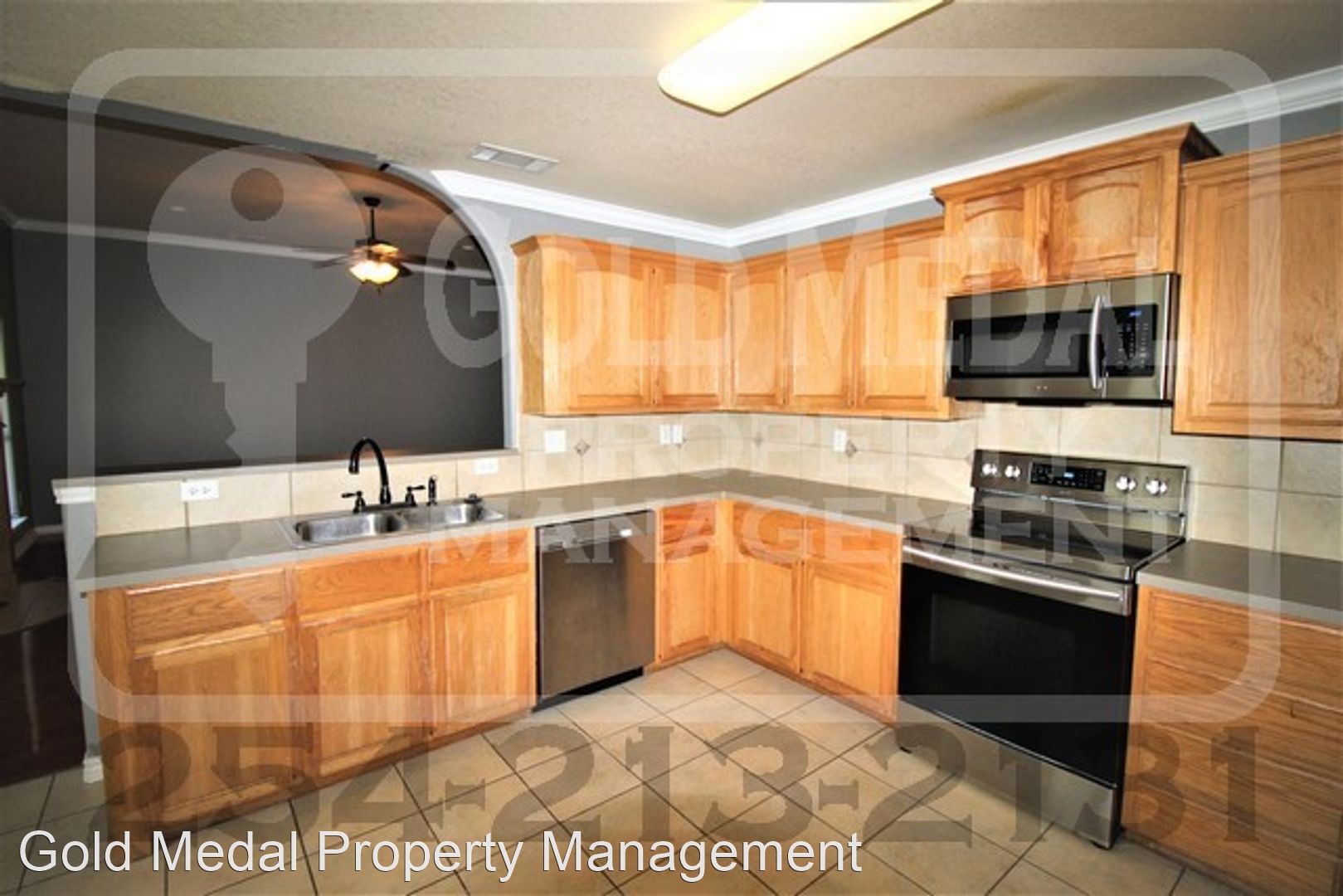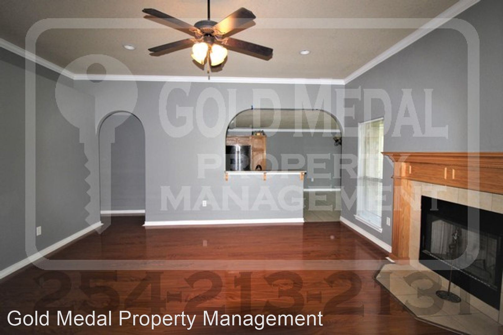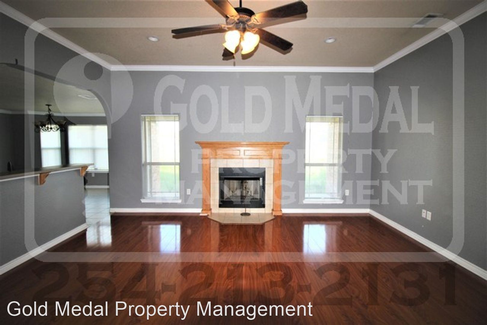 The spacious entry-way has blue-grey tone paint with ceramic tile flooring and leads into the living room. The living room has laminate wood flooring with the grey-blue tone paint that matches the entry-way, kitchen and hallway, fireplace, ceiling fan, and recessed lighting. The kitchen has neutral tones with ceramic tile flooring, tile back splash, and plenty of cabinet and counter space. The appliances are stainless steel to include a French door refrigerator with a freezer pull out drawer, a glass top range, dishwasher, and over the range microwave. The dining room is adjacent to the kitchen and has ceramic tile flooring with the blue-grey tone paint. The hallway next to the kitchen holds the second bathroom as well as the three secondary bedrooms. The bathroom has ceramic tile flooring with a neutral tone tile tub surround and blue-grey tone paint to match the rest of the home. Two of the bedrooms have lightly used, neutral beige carpeted flooring and the other has the laminate wood flooring that matches the living room and master bedroom. All three have ceilings fans and spacious walk in closets.